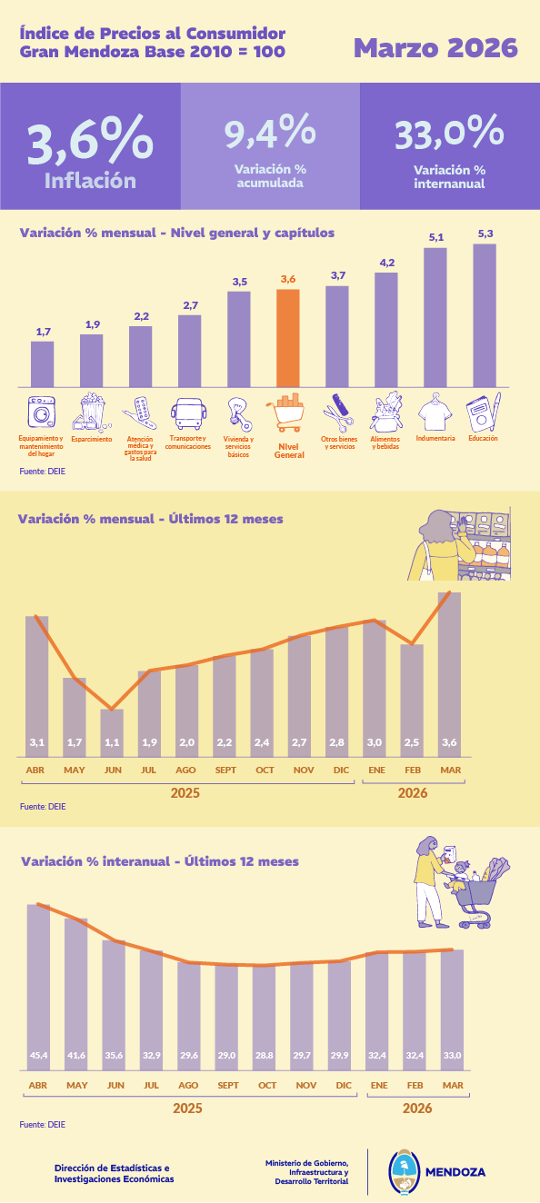En tal contexto, el nivel general del Índice de Precios al Consumidor para el Gran Mendoza registró en marzo una variación del 3,6% con relación al mes anterior. La variación acumulada fue del 9,4%. A su vez, la variación interanual trepó al 33%.