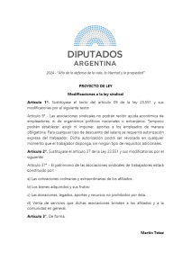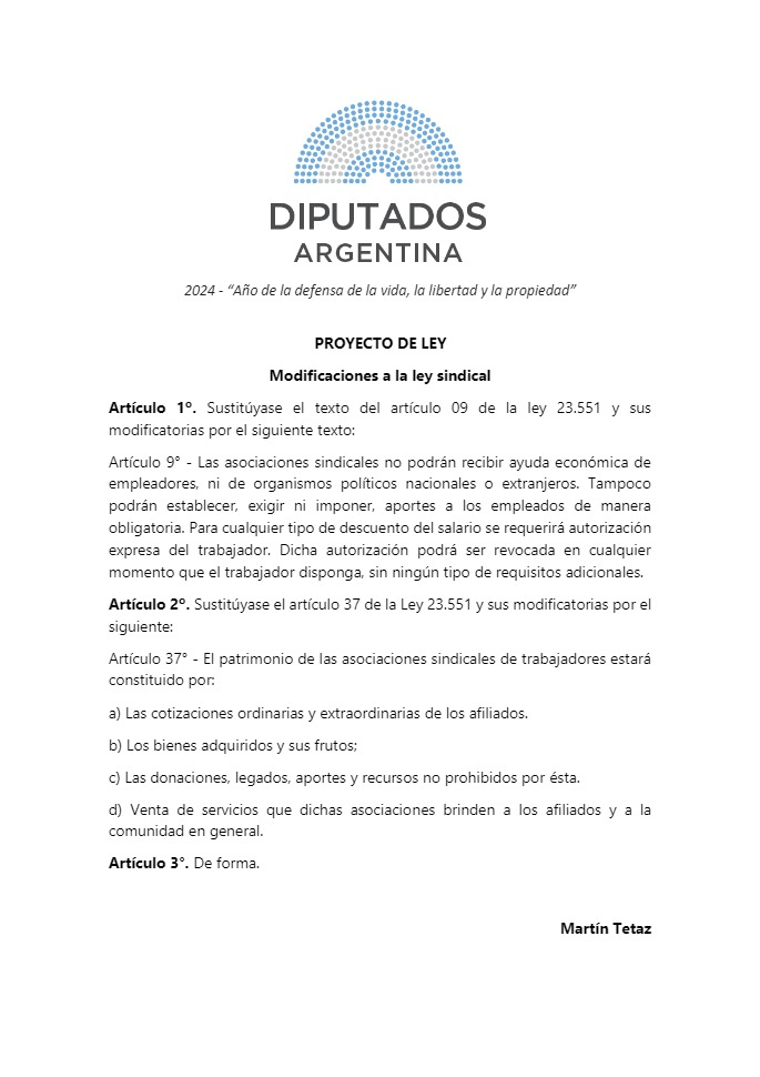 Por medio de este proyecto buscan sustituir el artículo 9 de la Ley 23.55. “Las asociaciones sindicales no podrán recibir ayuda económica de empleadores, ni de organismos políticos nacionales o extranjeros. Tampoco podrán establecer, exigir ni imponer, aportes a los empleados de manera obligatoria. Para cualquier tipo de descuento del salario se requerirá autorización expresa del trabajador. Dicha autorización podrá ser revocada en cualquier momento que el trabajador disponga, sin ningún tipo de requisitos adicionales”.