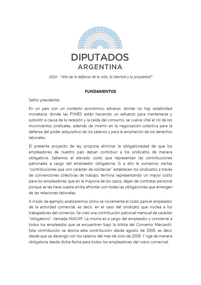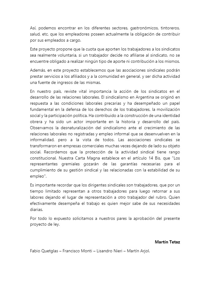 También expresó que “es mucho más grande la retención sindical que las cuotas y contribuciones”, y recordó que el año pasado presentó una iniciativa que proponía la eliminación la obligatoriedad de la cuota solidaria y sumó: “Ahora ampliamos la protección al trabajador eliminando cualquier descuento, como por ejemplo seguros de sepelio, seguros de vida, cursos de capacitación, turismo, etc”.