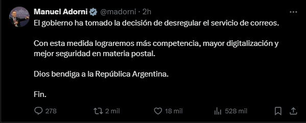 “El Gobierno ha tomado la decisión de desregular el servicio de correos. Con esta medida lograremos más competencia, mayor digitalización y mejor seguridad en materia postal. Dios bendiga a la República Argentina. Fin”, expresó Adorni en sus redes sociales.