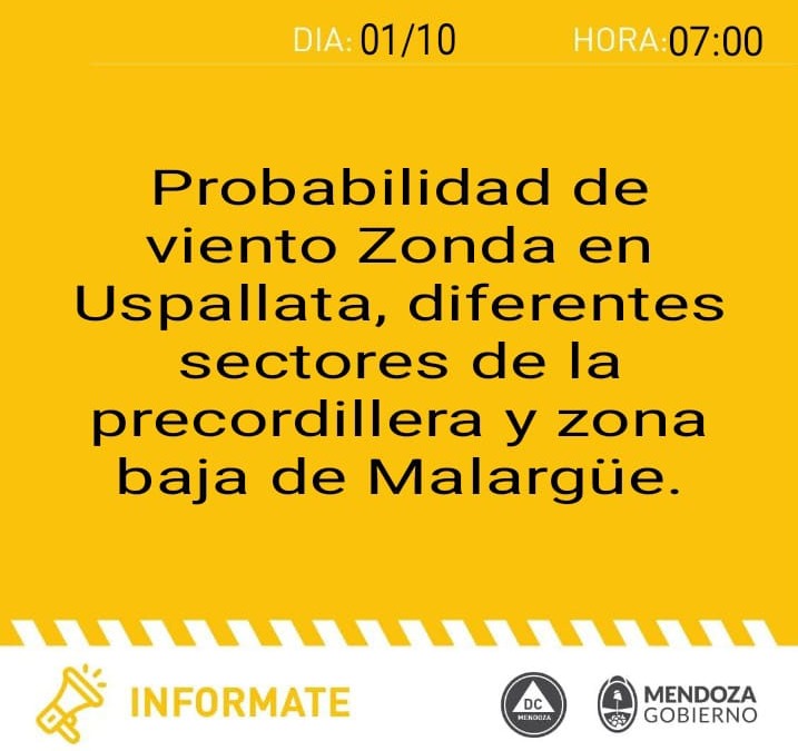 En ese sentido, desde el Servicio Meteorológico Nacional (SMN) comunicaron que continúa la probabilidad de que el fenómeno siga soplando en Uspallata, Malargüe y Precordillera.