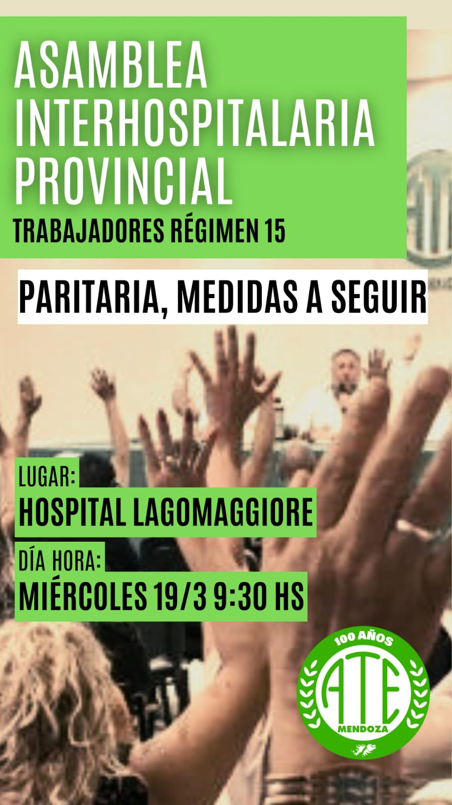 “Hace dos semanas que los compañeros y compañeras estatales del Régimen 15 vienen en conflicto, con asambleas y retención de servicio en cada lugar de trabajo”, continuó y recordó que este miércoles se llevará a cabo una “Asamblea Interhospitalaria en el Hospital Lagomaggiore, para definir la fecha del PARO y la huelga en toda la provincia de Mendoza”, concluyó.