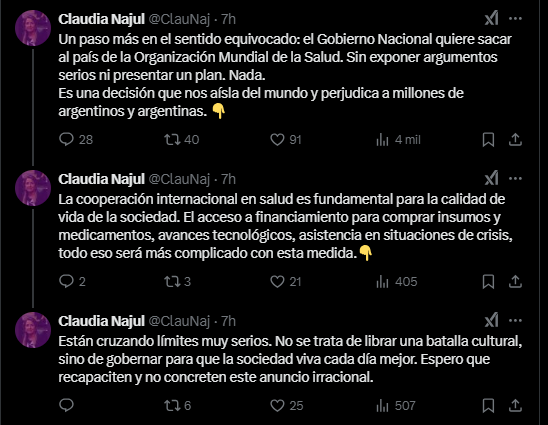La ex ministra de Salud, y actual senadora nacional, Claudia Najul, fue lapidaria. “Un paso más en el sentido equivocado: el Gobierno Nacional quiere sacar al país de la Organización Mundial de la Salud. Sin exponer argumentos serios ni presentar un plan. Nada”.