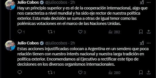 El diputado nacional Julio Cobos fue otro de los que cargó contra el Gobierno nacional. “Esta mala decisión se suma a otras de igual tenor como las polémicas votaciones en el marco de las Naciones Unidas”, sostuvo tras destacar la importancia del organismo.