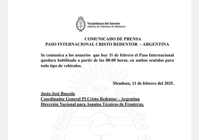 Se comunica a los usuarios que hoy 11 de febrero, el Paso Internacional quedará habilitado a partir de las 8:00 horas, en ambos sentidos para todo tipo de vehículos“, dieron a conocer mediante un comunicado.
