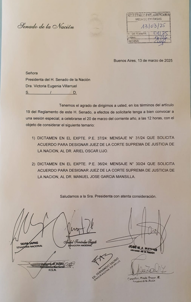 La solicitud se da en medio del tironeo político en la Comisión de Acuerdos, donde el pliego de García Mansilla tuvo un dictamen de rechazo por parte del peronismo.