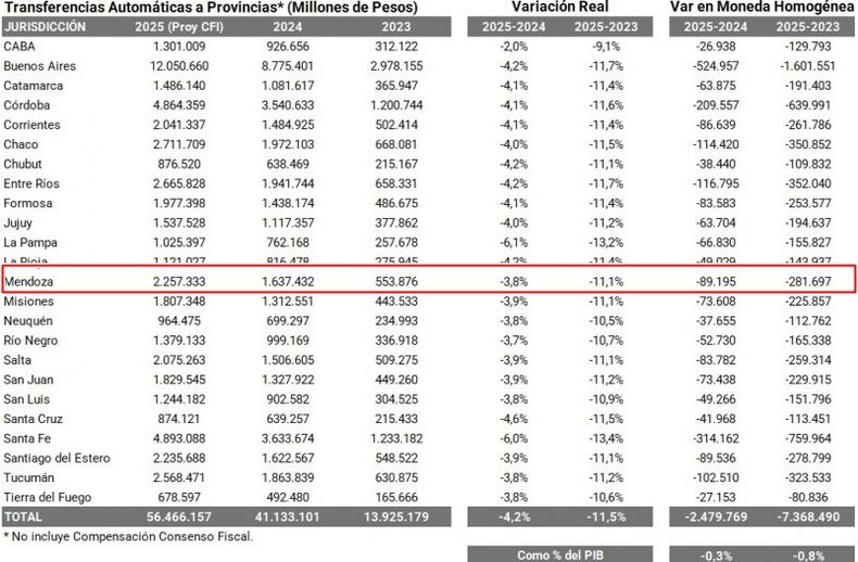 En el caso de Mendoza, la caída real en la Coparticipación fue de 3,8% entre 2024 y 2025 y de 11,1% si se lo compara con el último año de gobierno de Alberto Fernández.