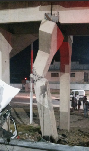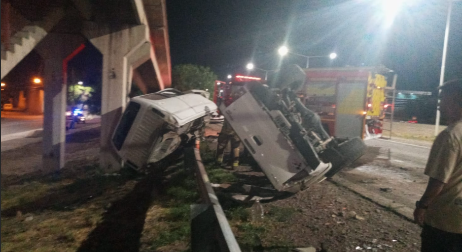 Tras cruzar el puente, impactó contra una columna de la pasarella que sostiene el puente del lugar, para posteriormente seguir camino y volcar con el rodado.