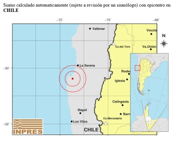 Por su parte, el epicentro fue registrado a 309 kilómetros al noroeste de San Juan; 372 kilómetros al noroeste de Mendoza; y a 49 kilómetros al sur de Coquimbo.