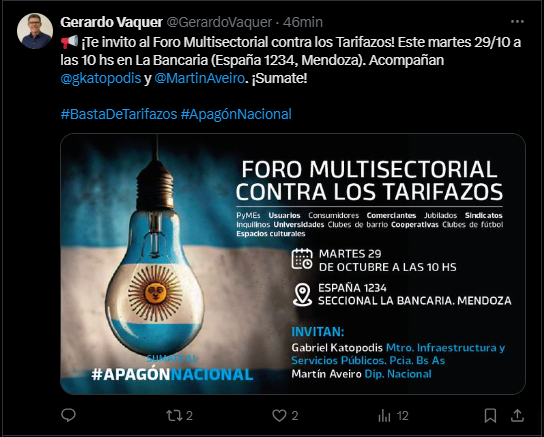 El apagón, previsto para el 31 de octubre a las 21:00, es respaldado por diferentes actores del peronismo, entre ellos Martín Aveiro. Inclusive, el diputado mendocino será uno de los actores que será parte de la presentación que Katopodis realizará hoy en la sede de La Bancaria de calle España, en Ciudad.
