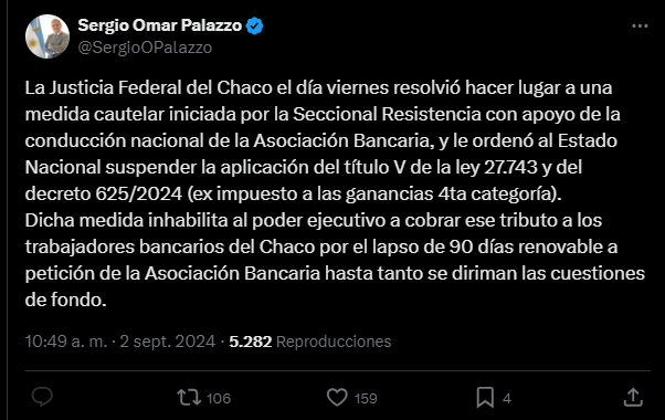 A través de sus redes sociales, el titular del gremio de los trabajadores bancarios, Sergio Palazzo, destacó el fallo de la justicia federal de Chaco. El líder gremialista es uno de los dirigentes gremiales que se puso al frente de la estrategia contra Ganancias.