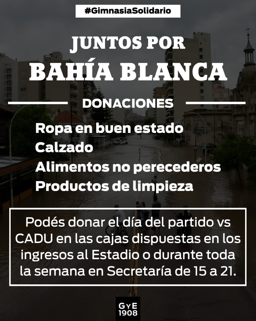 Gimnasia y Esgrima de Mendoza, al igual que muchos clubes de todo el país, por estas horas se encuentran abocados a la recolección de alimentos, ropa en buen estado, calzado, productos de limpieza y alimentos no perecederos para colaborar con la comunidad de Bahía Blanca, recientemente golpeada por un feroz temporal.