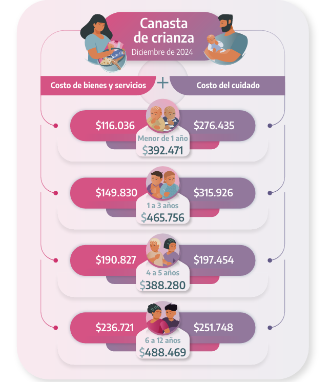 De acuerdo con la canasta de crianza, lanzada por el organismo en marzo de 2024, los hogares argentinos necesitaron entre $392.471 y $488.469 para cubrir los gastos asociados a la crianza de un niño, dependiendo de su edad.
