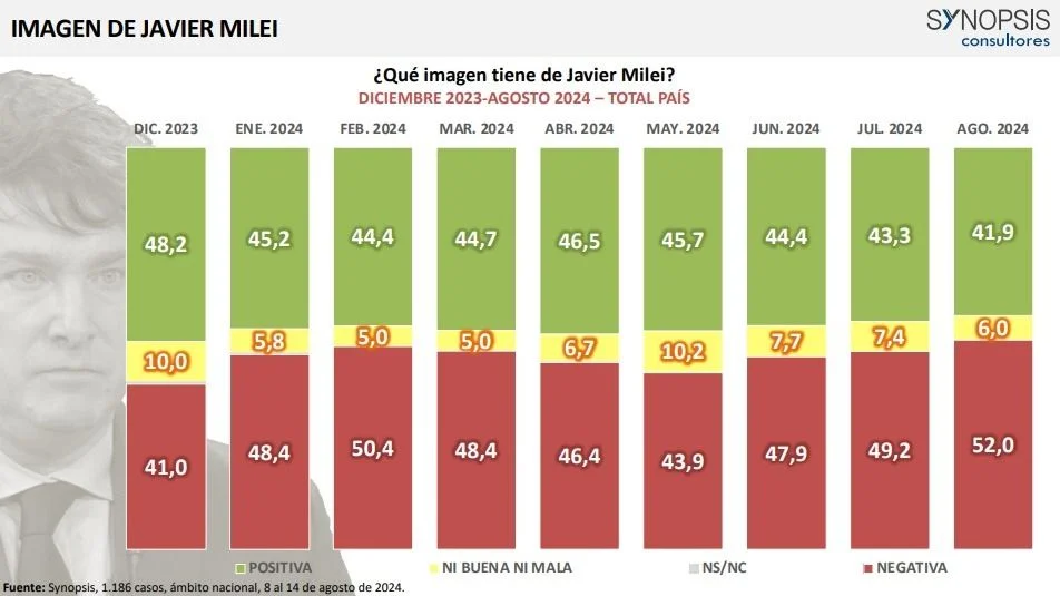 Desde que asumió la Presidencia, la percepción pública de Milei sufrió una notable caída. Al inicio de su mandato, Synopsis registraba una imagen positiva del 48,2%, frente a una negativa del 41%. Sin embargo, casi nueve meses después, en agosto, estos números se han invertido parcialmente: la imagen positiva ha descendido al 41,9%, mientras que la negativa ha aumentado al 52%.