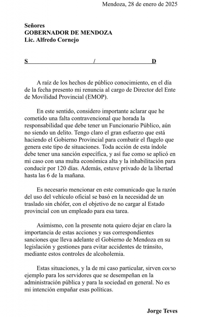 Finalmente, Jorge Teves presentó la renuncia y dejó su cargo al frente del Ente de Movilidad Provincial (EMOP), tras haber sido detenido por circular un vehículo oficial bajo los efectos del alcohol.