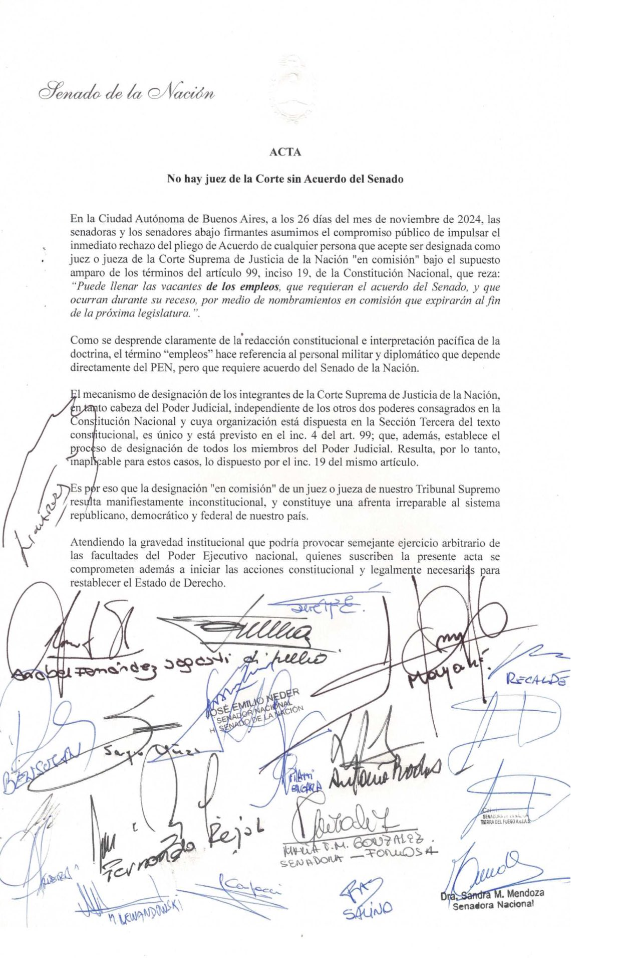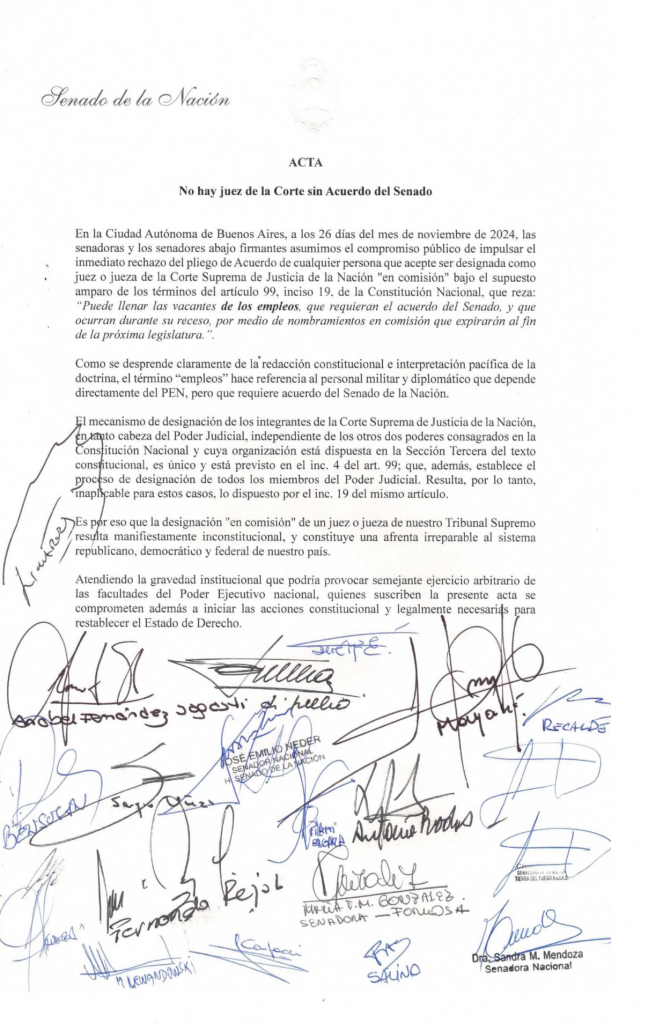 Por medio de un acta titulada “no hay juez de la Corte sin Acuerdo del Senado”, los miembros del interbloque, entre ellos la mendocina Anabel Fernández Sagasti, adelantaron que impulsarán “el inmediato rechazo del pliego de Acuerdo de cualquier persona que acepte ser designada como juez o jueza de la Corte Suprema de Justicia de la Nación ‘en comisión’ bajo el supuesto amparo de los términos del artículo 99, inciso de la 99, de la Constitución Nacional, que reza: ‘puede llenar las vacantes de los empleos, que requieran el acuerdo del Senado, y que ocurran durante su receso, por medio de nombramientos en comisión que expirarán al fin de la próxima legislatura’”.