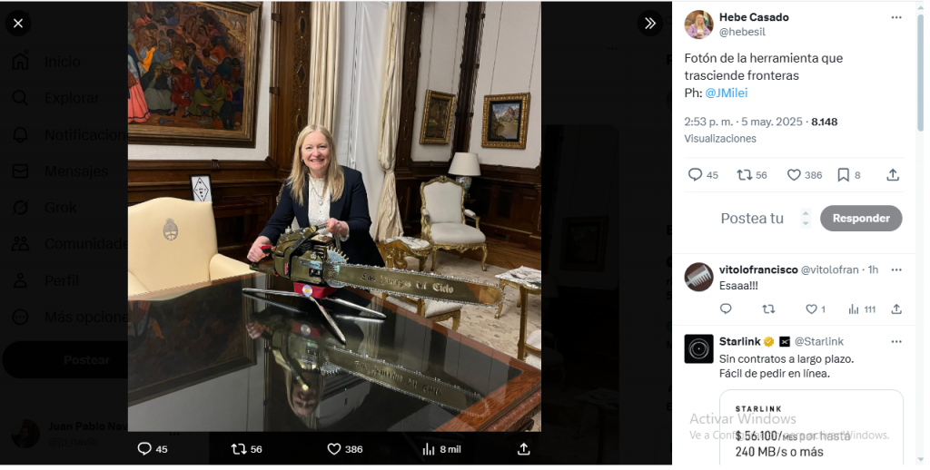 De hecho, la propia Casado mostró la foto que le habría tomado el propio Javier Milei. En la imagen en cuestión, se la ve a la sanrafaelina junto a una motosierra.