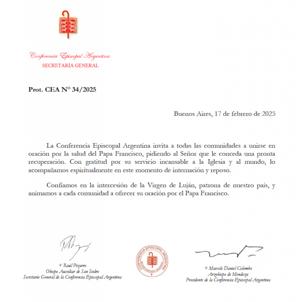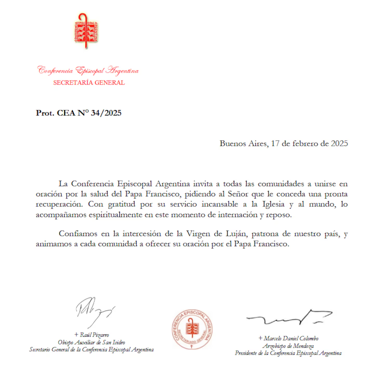 “La Conferencia Episcopal Argentina invita a todas las comunidades a unirse en oración por la salud del Papa Francisco, pidiendo al Señor que le conceda una pronta recuperación. Con gratitud por su servicio incansable a la Iglesia y al mundo, lo acompañamos espiritualmente en este momento de internación y reposo”, afirmó el escrito.
