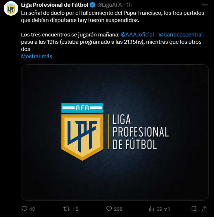 La Liga Profesional de Fútbol (LPF) emitió este lunes un comunicado oficial en el que anunció la suspensión de los tres partidos previstos para hoy, como muestra de respeto por el fallecimiento del Papa Francisco, ocurrido a los 88 años.