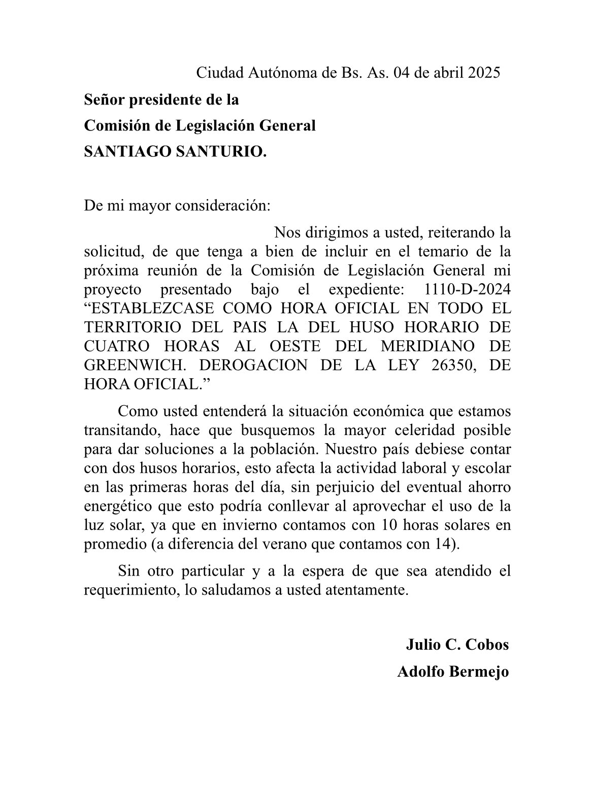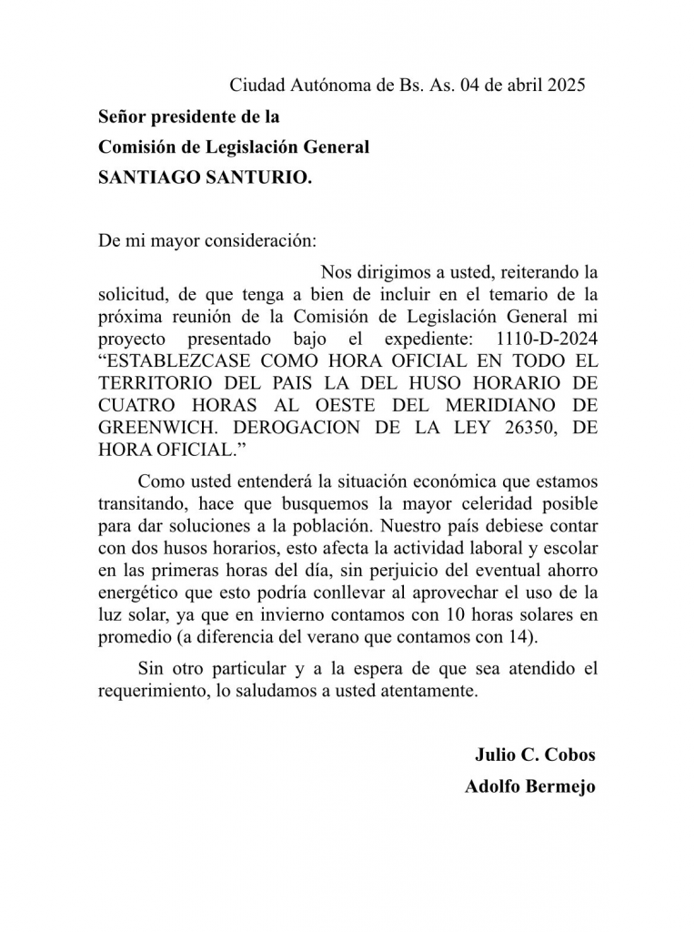 En sintonía con la modificación horaria que implementó desde este sábado Chile, los diputados Julio Cobos y Adolfo Bermejo pidieron “el tratamiento urgente” de un viejo proyecto impulsado por los mendocinos, el cual apunta al cambio de huso horario en Argentina.
