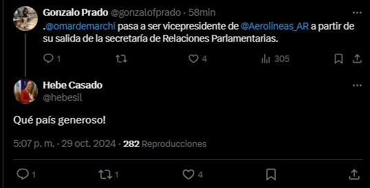 Además, en otro mensaje posteado posteriormente, sostuvo: “Al final el presidente, que se queja de las empresas del Estado, las usa como bolsa de empleo para ñoquis. Yo a Javier Milei lo respeto y admiro pero en esta decisión no lo acompaño ni un poquito“.