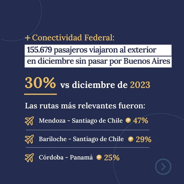 Durante diciembre, 155.679 pasajeros realizaron este tipo de conexión, superando un 30% la cifra de diciembre de 2023. Entre las rutas más relevantes del mes, sobresalen Mendoza – Santiago de Chile, con un aumento del 47% (tras el regreso de Jetsmart a esta ruta después de 5 años) respecto al mismo período de 2023; Bariloche – Santiago de Chile, con un 29% de aumento respecto a diciembre del año anterior; y Córdoba – Panamá, que aumentó un 25%.