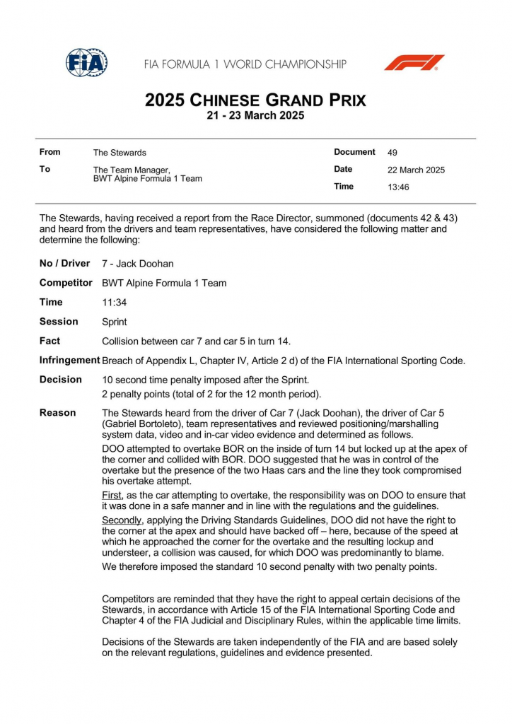 Doohan buscó adelantarse a Bortoleto por el interior de la curva 14, pero bloqueó la pista en el vértice de la curva y lo imapctó. El australiano dijo que controlaba el adelantamiento, pero la presencia de los dos coches Haas y la trayectoria que tomaron “dificultaron su intento”, se lee en el fallo de la FIFA.