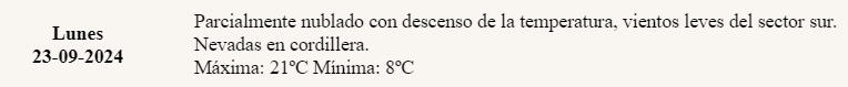 Además, anunciaron la llegada de “vientos leves del sector sur” y “nevadas en cordillera”.