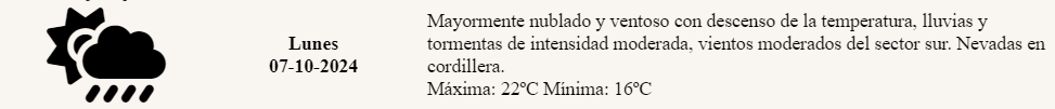 Además, pronosticaron “lluvias y tormentas de intensidad moderada”. Por otra parte, indicaron que podrían darse “vientos moderados del sector sur” y “nevadas en cordillera”.