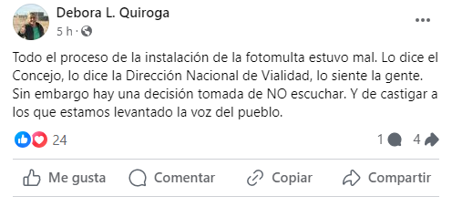 “Todo el proceso de la instalación de la fotomulta estuvo mal. Lo dice el Concejo, lo dice la Dirección Nacional de Vialidad, lo siente la gente. Sin embargo hay una decisión tomada de NO escuchar, y de castigar a los que estamos levantado la voz del pueblo“, expresó la edil.