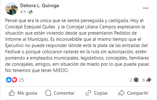 A través de sus redes sociales, Quiroga fue por más y denunció: “Pensé que era la unica que se sentía perseguida y castigada. Hoy el concejal Ezequiel Quiles y la concejal Liliana Campos expresaron la situación que están viviendo desde que presentaron Pedidos de Informe al Municipio”.