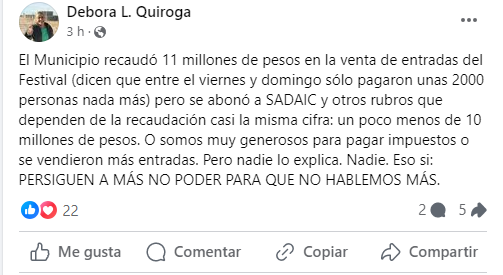 En otro de los posteos, la titular del Legislativo señaló que “el Municipio recaudó 11 millones de pesos en la venta de entradas del Festival (dicen que entre el viernes y domingo sólo pagaron unas 2000 personas nada más), pero se abonó a SADAIC y otros rubros que dependen de la recaudación casi la misma cifra: un poco menos de 10 millones de pesos”.