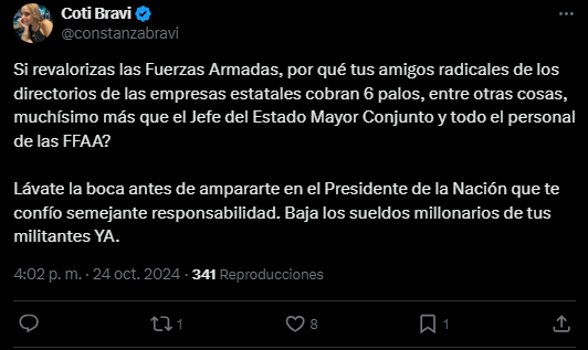 Lávate la boca antes de ampararte en el Presidente de la Nación que te confío semejante responsabilidad. Baja los sueldos millonarios de tus militantes YA”, completó la influencer libertaria.