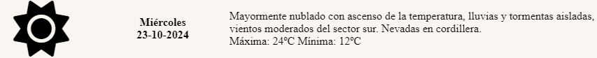 Además, pronosticaron “vientos moderados del sector sur” y “nevadas en cordillera”. En cuanto a la máxima, la misma podría llegar a los 24 grados.