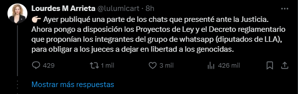 De acuerdo a lo ventilado por Arrieta, dicha propuesta es la que impulsaban en el grupo de Whatsapp los legisladores aliados a Javier Milei para presionar a los jueces para que recuperen la libertad los genocidas.