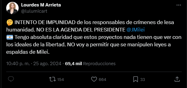 El pasado sábado, Lourdes Arrieta dio a entender que La Libertad Avanzaba trabaja en un proyecto que tenía por objetivo beneficiar a represores, y que además había una especie de acuerdo con el kirchnerismo para que salgan de prisión algunos acusados por hechos de corrupción.