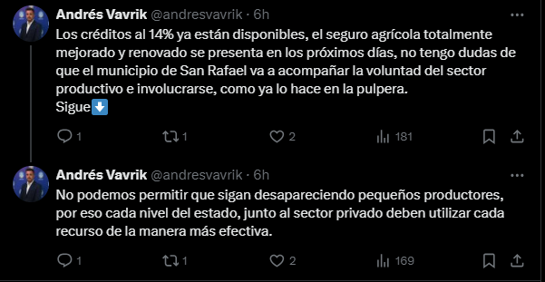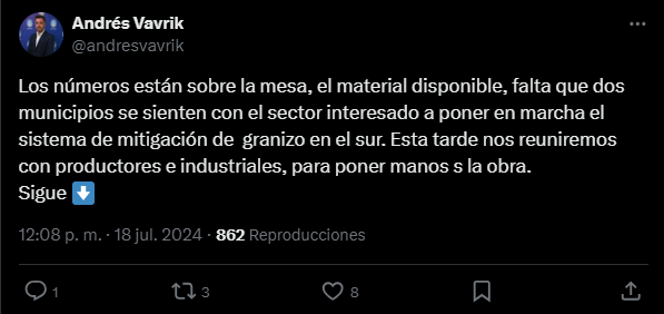 Vavrik, a través de sus redes sociales, expuso: “Los números están sobre la mesa, el material disponible, falta que dos municipios se sienten con el sector interesado a poner en marcha el sistema de mitigación de granizo en el sur”.