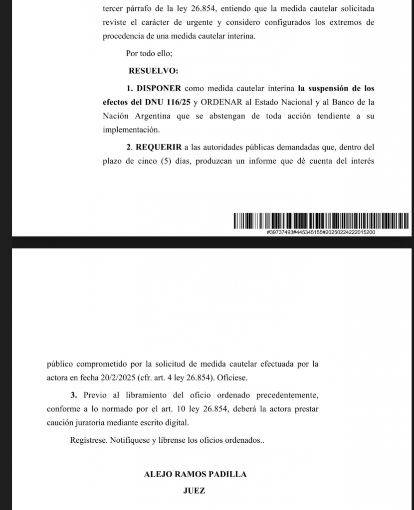 “Disponer como medida cautelar interina la suspensión de los efectos del decreto 116/25 y ordenar al Estado Nacional y al Banco de la Nación Argentina que se abstengan de toda acción tendiente a su implementación“, se lee en la resolución impulsada por el magistrado.