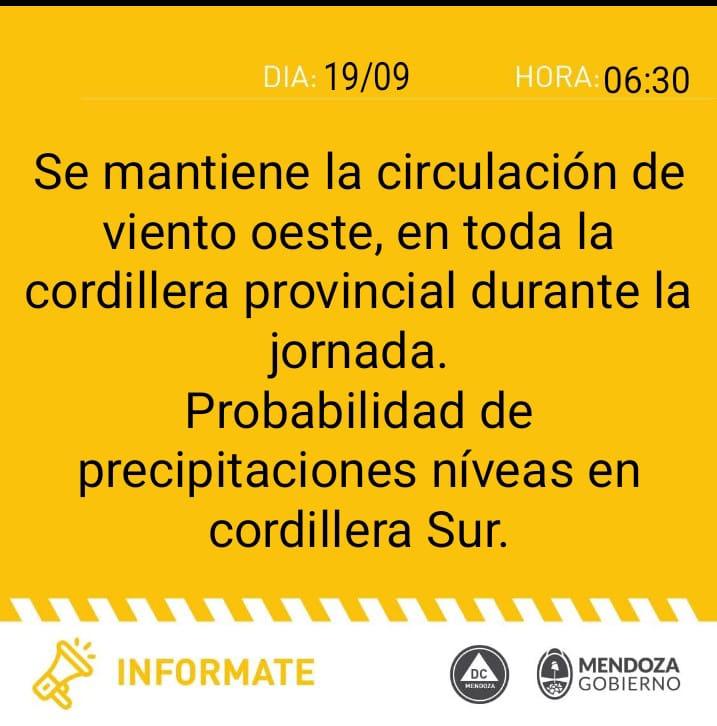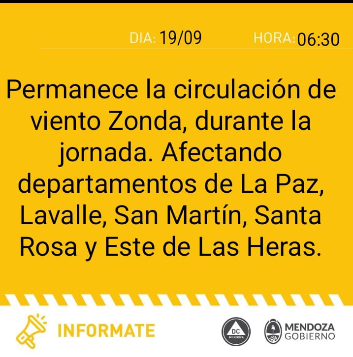 Desde la Dirección provincial de Defensa Civil monitorean la situación meteorológica, por esto, emitieron tres nuevas alertas que regirán todo el día. Una de ellas, informa sobre la “circulación de viento zonda, moderado a fuerte” durante la jornada y que afectará zona Sur, pre cordillera, Valle de Uco, Gran Mendoza, Junín y Rivadavia.