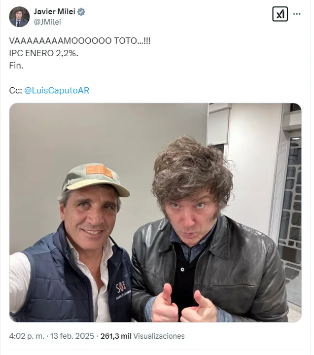 El presidente Javier Milei se volcó a sus redes sociales y celebró la inflación del 2,2% correspondiente al mes de enero.