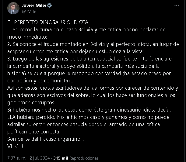 El presidente Javier Milei lanzó una fuerte crítica en redes contra quienes cuestionan su política internacional y tituló como “El perfecto dinosaurio idiota” un mensaje que publicó en su cuenta de X, a la vez que enumeró a quien “se come la curva en el caso Bolivia” y lo critica “por no declarar de modo inmediato”.