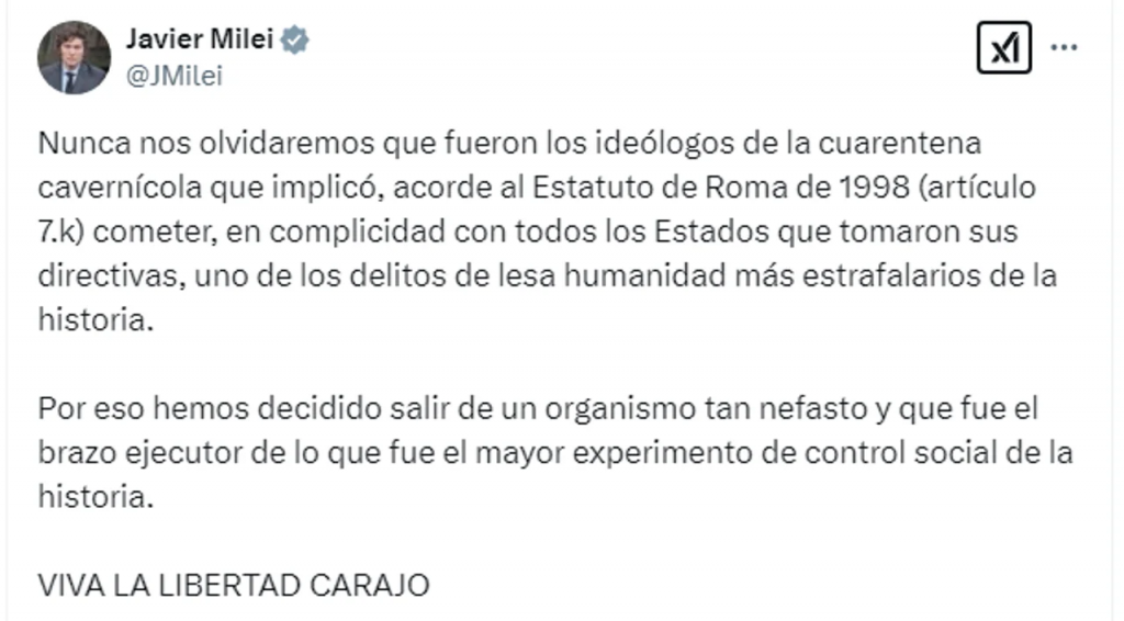 La publicación de Milei se suma al anuncio de Adorni y al posterior comunicado oficial de Presidencia, donde la Argentina aseveró que la OMS “falló en su mayor prueba de fuego” al promover “cuarentenas eternas sin sustento científico” durante la pandemia del Covid-19.