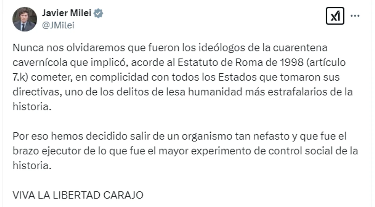 El presidente de la Nación, Javier Milei, utilizó sus redes sociales para referirse a la salida de la Argentina de la Organización Mundial de la Salud (OMS).