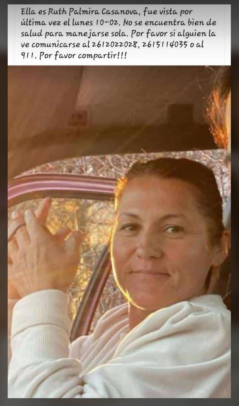 Cuando todavía Mendoza no sale de su asombro por el femicidio de Alejandra Cuevas, ahora la mira está puesta en saber que fue lo que ocurrió con Ruth Palmira Casanova, una mujer de 48 años que desapareció en Ciudad.