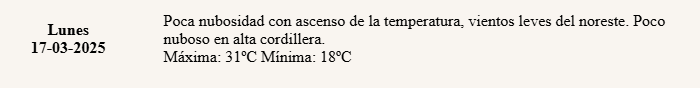 Además, anunciaron la llegada de “vientos leves del noreste” y poca nubosidad en cordillera.
