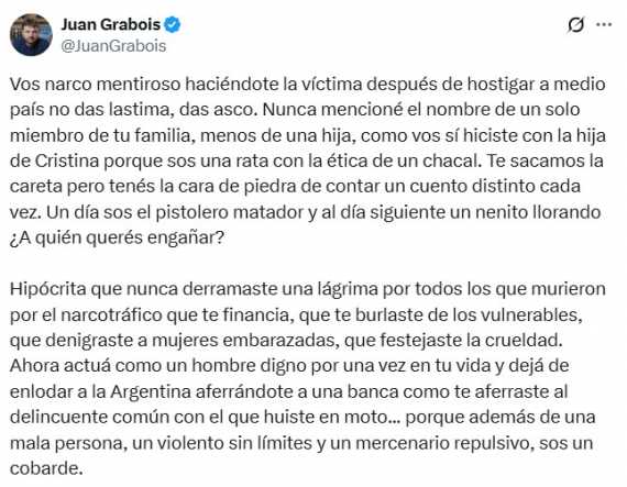 Finalmente, Grabois cerró su mensaje con una de las frases más duras: “Ahora actuá como un hombre digno por una vez en tu vida y dejá de enlodar a la Argentina aferrándote a una banca como te aferraste al delincuente común con el que huiste en moto… porque además de una mala persona, un violento sin límites y un mercenario repulsivo, sos un cobarde”.