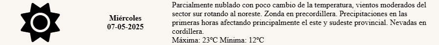 Por otra parte, pronosticaron “Zonda en precordillera” y precipitaciones durante las primeras horas, “afectando principalmente al este y sudeste provincial”.