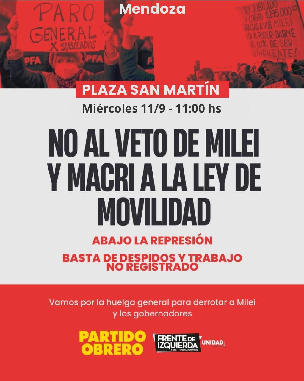 De hecho, el Polo Obrero informó que llevarán a cabo una ruidosa protesta en la Plaza San Martín a las 11:00. “No al veto de Milei y Macri a la Ley de Movilidad. Abajo la represión. Basta de despidos y trabajo no registrado”, se lee en uno de los flayers que hicieron trascender.