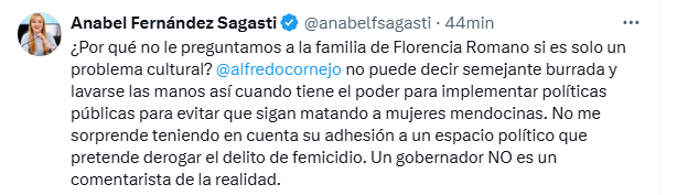 “Alfredo Cornejo no puede decir semejante burrada y lavarse las manos así cuando tiene el poder para implementar políticas públicas para evitar que sigan matando a mujeres mendocinas”, añadió.