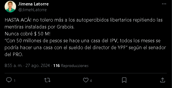 “HASTA ACÁ! no tolero más a los autopercibidos libertarios repitiendo las mentiras instaladas por Grabois. Nunca cobré $ 50 M! ‘Con 50 millones de pesos se hace una casa del IPV, todos los meses se podría hacer una casa con el sueldo del director de YPF según el senador del PRO’“, se lee en un reciente posteo de la funcionaria.